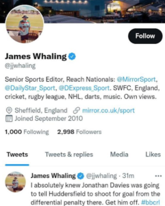 The sports Editor, James Whaling, who works for papers including The Mirror and Daily Star said on Twitter: “I absolutely knew Jonathan Davies was going to tell Huddersfield to shoot for goal from the differential penalty there. Get him off. (Hashtag) bbcrl, during Saturday’s Challenge Cup match between the Huddersfield Giants and Wigan Warriors, which Wigan won 16 – 14..