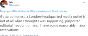 He said on Twitter: “I really hope it will be unbiased and not rammed with the anti-government nationalist diatribe from another Welsh news outlet…” and Mr Marshall answered: “Our main aim isn’t to tell people what to think…”.