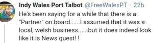 Plainly the connection with Gannett Co., Inc, is also making those people uncomforable who might otherwise have supported the venture. One said on Twitter “for me it’s important to be owned and run in Wales”. Another declared: “He’s (the ‘driving force’ for the ‘project’, Mr Marshall) been saying for a while that there is a “Partner” on board……I assumed that it was a local, welsh business……but it does indeed look like it is News quest! !”.