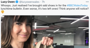 In the past, Mrs Owen has called a ‘crisis’, as well, wearing odd shoes into the office to broadcast the lunchtime bulletin, and asked whether anyone would notice. She even included for us a shocked face emoji after that comment, and following it Mrs Owen published on Twitter: “Crisis over!”.