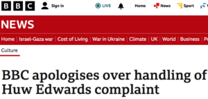 A news item on the BBC stated: “Vicky Flind, the wife of news reader Huw Edwards, has named him as the BBC presenter facing allegations over payments for sexually explicit images in a statement issued on his behalf”.
