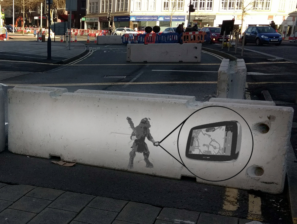 It covers half a barrier with a picture of the legendary Minotaur of Greek legend who famously dwelled within the Labyrinth. The Minotaur is shown consulting a Sat Nav device in a desperate attempt to find his way out of Swansea city centre.