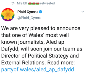 In it he says: “A former Chief Executive of Plaid Cymru, Rhuanedd has also worked as an advisor to the Welsh Government and later as Policy Advisor to the Presiding Officer of the National Assembly for Wales”.