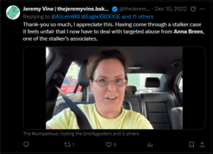 Her YouTube profile proclaims gushingly: ” Anna began her training business in September 2017 and has since trained thousands of students, teaching comms and marketing teams for clients such as Admiral and Public Health Wales to citizen journalism”, however it does NOT include the fact that she has been accused of pursuing a famous personality with constant threat, or of defending a man who was jailed for stalking.