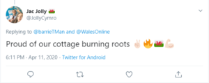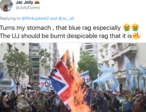 Contentious Rhydian Bowen Phillips is a regular fixture on BBC Cymru Wales Radio Cymru (BBC CW RC) and has re-tweeted the comments of ‘Jac Jolly’ about the Welsh language, who has also said on social media that he is proud cottages in Wales were burned down and tweeted: “The UJ should be burnt despicable rag that it is” with an emoji of a burning flame after the remark.