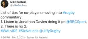It is evident that Mr Bubbins is also a supporter of the contentious rugby commentator (and former Welsh international Jonathan Davies). On Twitter he has advised ex-players anxious to break into punditry, to: “Listen to Jonathan Davies doing it on @BBCSport”.