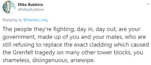 Remarks like these come amid mounting concern at what Mr Bubbins has been saying on social media. In reply to a message about the Grenfell Tower tragedy by former UK Prime Minister Theresa May, he said on Twitter: “The people they’re fighting, day in, day out, are your government, made up of you and your mates, who are still refusing to replace the exact cladding which caused the Grenfell tragedy on many other tower blocks, you shameless, disingenuous, arsewipe.”