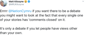 The tweet from Matt Kilcoyne was labelled for the nationalist website Nation.Cymru (NC), and included a link to an ‘opinion’ piece it published on Sunday which proclaimed: “Welsh Labour needs to stop denying and start embracing the debate over Welsh independence”.