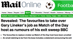 MailOnline (MO) have published: “The favourites to replace Gary Lineker as Match of the Day host have been revealed after MailOnline broke the story that BBC bosses are plotting his exit. Fresh doubts emerged over his future as presenter after MailOnline saw an email which appeared to suggest chiefs are writing up a statement about his departure.”