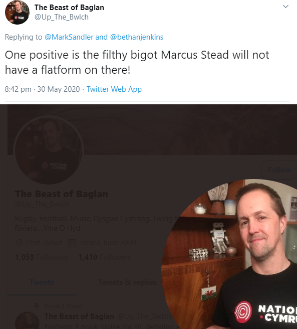 He said:  “One positive is the filthy bigot Marcus Stead will not have a flatform (sic) on there!”, but the website, as well as its ‘Editor’ Ifan Morgan Jones, has long been controversial.