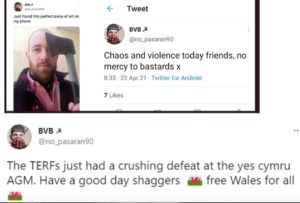 The online remarks by ‘BVB’ (who includes a hammer and sickle in his Twitter heading) declare: “Chaos and violence today friends, no mercy to bastards x”, and in another tweet he has included a picture of a man carrying an axe. He has also proclaimed: “The TERFs (trans-exclusionary radical feminists) just had a crushing defeat at the yes cymru AGM. Have a good day shaggers free Wales for all”, with Welsh flag emojis attached to the contentious comment. Another announcement on Twitter was: “The @YesCymru vote shows that the majority of the membership is decent and wants a fair and equal indy Wales for all. Hopefully, the minority intent on derailing with hatred will disappear. Time to get the message out of the twittersphere and onto the doorstep. Cymru Rhydd (Free Wales).”(Welsh flag emoji).