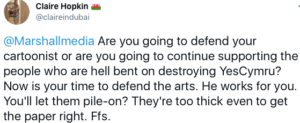 Evidently Mr Marshall (who is apparently seen as part of the Welsh-speaking establishment) does not know his journalist libel law either (which may, possibly, have contributed to the winding-up of his TNW), because he has said on Twitter that Phil is a ‘liar’ and an “obsessive coward”, linking the inaccurate comments to an earlier piece that had been written about the scheme. Mr Marshall has also called Phil a “self proclaimed journalist”, which may not be libellous but is provably wrong as he trained to be a journalist in 1983 on the best newspaper course in the UK before moving into television, and he has won an enormous number of awards.