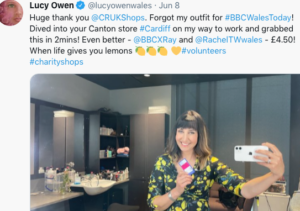 Despite this, Mrs Owen tweeted with a picture: “Huge thank you @CRUK (Cancer Research UK) Shops. Forgot my outfit for (hashtag) BBCWalesToday! Dived into your Canton store (hashtag) Cardiff on my way to work and grabbed this in 2mins! Even better – @BBCXRay and @RachelTWwales – £4.50! When life gives you lemons (emojis lemons and heart) (hashtag) volunteers (hashtag) charityshops”.