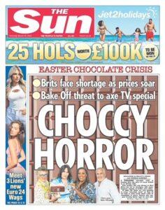 Under the front page headline: ‘CHOCCY HORROR’, The Sun ‘reported’ yesterday: “A WORDWIDE chocolate crisis is looming after the price of cocoa trebled to an all time high”.