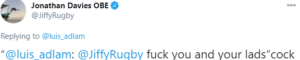 After seeing Mr Davies’ tweet and comment on YouTube, a leading sports journalist who supplies material for UK publications, told us: “He (Jonathan Davies) really is a disgusting individual”.