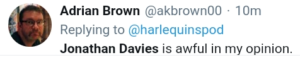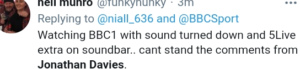 Contentious Jonathan Davies was described as “awful”, “biased”, “insufferable”, spouting “bullshit” and sounding as if he was “masturbating”, on Twitter, with the BBC being urged to “get rid” of him.