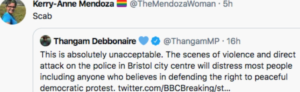 The MP for Bristol West Thangam Debbonaire (the Shadow Secretary of State for Housing) said on Twitter about riots in the city: “This is absolutely unacceptable. The scenes of violence and direct attack on the police in Bristol city centre will distress most people including anyone who believes in defending the right to peaceful democratic protest”, and she included a link to a BBC report about the protest.