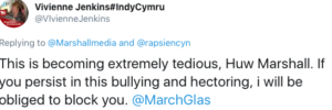 This time a so-called funny man called Huw Marshall who is the driving force for The National (TN), attempted to have our website closed down, alleging “violent threats and harassment” when there have been no threats of violence from our journalists, and the only harassment has come from Mr Marshall after he used social media to dub senior Welsh politicians “twats”, and me a “liar”.