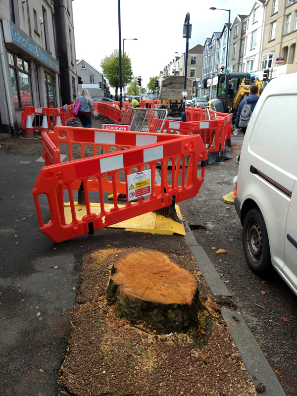 Fifty mature trees have been cut down in Swansea City centre as work begins in earnest on the Godzilla defences in preparation for the inevitable senseless rampage which conservative estimates predict will annihilate 50% of all local businesses. An undisclosed number of people will also be killed and or mutilated. The move has not been without controversy as the defences will be mostly constructed using the trees from the city centre. When council workmen began felling the trees it sparked a storm of outrage across social media and aggrieved residents took to the streets.