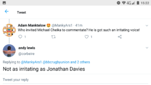 Earlier one of his detractors had said in a Tweet that Mr Davies was “tedious”, and that he should be removed from The BBC’s rugby league team, and another fan pleaded that he should just “shut up”.