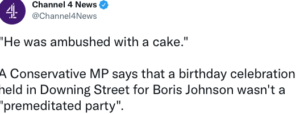 In defending Mr Johnson’s attendance at a birthday party in the Cabinet Room of Number 10 on June 19, 2020, his Northern Ireland minister, Conor Burns stated: “… he was in a sense, ambushed with a cake”.
