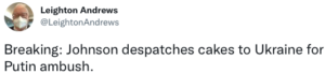 A Welsh dimension developed, too, with the former senior Welsh Government (WG) minister Leighton Andrews making a joke about it online: “Breaking: Johnson despatches cakes to Ukraine for Putin ambush”,