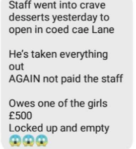 A recent text message about the latest escapades of Williams/Daniels said that he has: “…taken everything out AGAIN not paid the staff Owes one of the girls £500 locked up and empty”. Earlier another staff member at ‘Crave Desserts’ warned others on FB: “Nobody work for Crave desserts in Merthyr town, haven’t paid some of their staff for weeks, delivery drivers and kitchen staff, always says it will be in on Friday or Tuesday and I’m still waiting 5 weeks on along with others who worked there. Always got to beg for your money, Absolutely disgusting, you work the hours and expect to be paid! They have blocked me from their page and ain’t answering my messages, fuming!”.