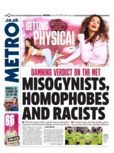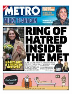 The Metro’s front page (under the headline: ‘RING OF HATRED INSIDE THE MET’), explained how a disciplinary panel had been told that a police sergeant led his officers in a two-year torrent of abuse against women, gay people, ethnic minorities and the disabled. The paper publicised how it had heard that in a What’sApp group named “Scarlet Squirrel S…”, Luke Thomas ‘joked’ about naming his dog “Auschwitz”, called a rapist cop “a legend…”, and said any non-binary person person was an “utter c…”. He repeatedly mocked Harvey Price, the disabled son of Katie Price.