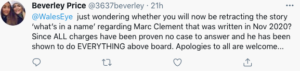 In the wake of this, a few days ago a reader of The Eye urged us on Twitter to retract the story ‘What’s in a name’ from November 11 (which was actually called ‘Inclement’) about Marc Clement “since ALL charges have been proven no case to answer and he has been shown to do EVERYTHING above board. Apologies to all are welcome…”