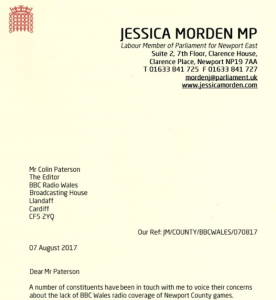 The reporting of Newport County games on RW has also led to a stern letter to him from a politician.