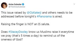 BBC journalist Anisa Subedar tweeted: “Raising the finger is NOT an IS salute.
