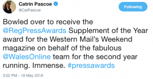 She called them “fabulous” on Twitter when she received the supplement of the year award at the Regional Press Awards.
