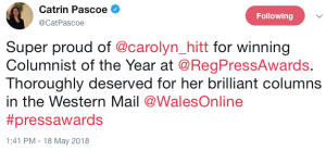 It was absolutely justified that your Western Mail writer Carolyn Hitt was named Columnist of the Year at the Regional Press Awards on Friday.