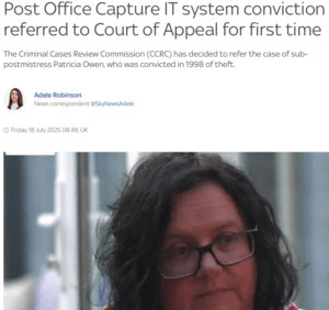 The Criminal Cases Review Commission (CCRC) has decided to refer the case of sub-postmistress Patricia Owen, who was wrongly convicted in 1998 of theft after being found guilty by a jury based on evidence from the faulty ‘Capture’ software, which was used in 2,500 branches between 1992 and 1999.