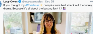 Mrs Owen also treated us to a video of how she suffered a “turkey drama” (presumably at her South Wales home) by leaving plastic on the Christmas roast, but it cannot compare to the crisis endured by the families to whom she broadcasts every night with the latest lockdown rules.
