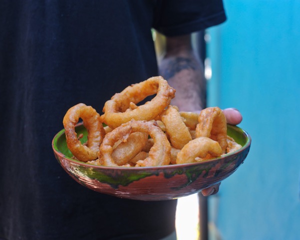 1/2 massive spanish onion cut into 1/2inch rings. Cut the stem end away and peel back a few layers. Toss rings with 1/2 cup flour.