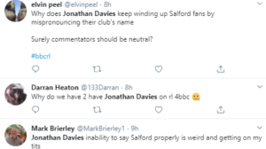 It was claimed: “Jonathan Davies ruins these games for me”. There were complaints about his mispronunciation of ‘Salford’, he was described as a “dipshit”, and one rugby league fan said “Why do we have 2 have Jonathan Davies on rl 4BBC” with a picture of an upset emoji after the comment.