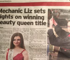 On page three of the South Wales Echo (the second most important news page after the front where there was a ‘tease’) a full picture of Elizabeth Jenkins was published in her Miss Wales 2018 sash, and another photograph of her at work as a mechanic.