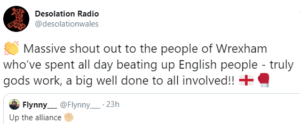 A picture of the march was posted on social media by Desolation Radio (DR) which has also said in the past: “Massive shout out to the people of Wrexham who’ve spent all day beating up English people – truly gods work, a big well done to all involved!!