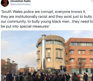 A photograph of the protest outside Cardiff Bay police station was published on Twitter by the organisation, which wrote above it: “‘South Wales police are corrupt, everyone knows it, they are institutionally racist and they exist just to bully our community, to bully young black men…they need to be put into special measures’”.