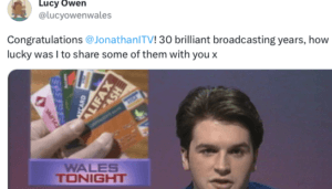 She, too, had worked at HTV/ITV Wales (as Lucy Cohen), and has made clear her links recently by tweeting congratulations to the ITV Wales presenter Jonathan Hill, after he had marked 30 years in broadcasting.