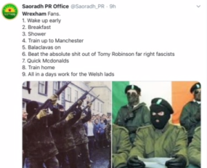 An alarming post on Twitter from ‘Saroadh PR’ said that some fans of the Welsh football club “beat the absolute shit out of Tomy (sic) Robinson (former English Defence League [EDL] leader) far right fascists” and backed the message with a picture of men in balaclavas holding guns aloft. The tweet outlined a series of mundane actions which included waking up early and taking a train to Manchester before the violence. It then proclaimed:  “All in a days work for the Welsh lads” – 197 accounts retweeted the message and more than 1,200 accounts liked it.