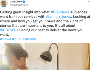 It is disconcerting, therefore, that the BBC Wales Today (WT) presenter Lucy Owen, tweeted about the latest round of audience research (there were many when I was there), and how it will enable them to give the stories that audiences desire.