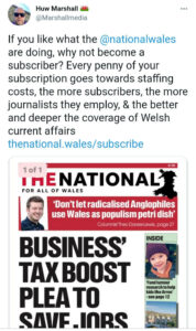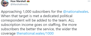 Comments on Twitter from Mr Marshall have also emphasised the difficulties in getting staff at the new Welsh newspaper, which was published both online and in a printed version. He initially stated: “If just 500 people subscribed to The National Wales they’d employ a business and economy editor…”. But four minutes later he tweeted: “Approaching 1,000 subscribers for the @nationalwales. When that target is met a dedicated political correspondent will be added to the team.”.