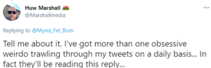‘Obsessive’ appears to be a word Mr Marshall favours, and on Twitter he has stated: “Tell me about it. I’ve got more than one obsessive wierdo trawling through my tweets on a daily basis… In fact they’ll be reading this reply…”.
