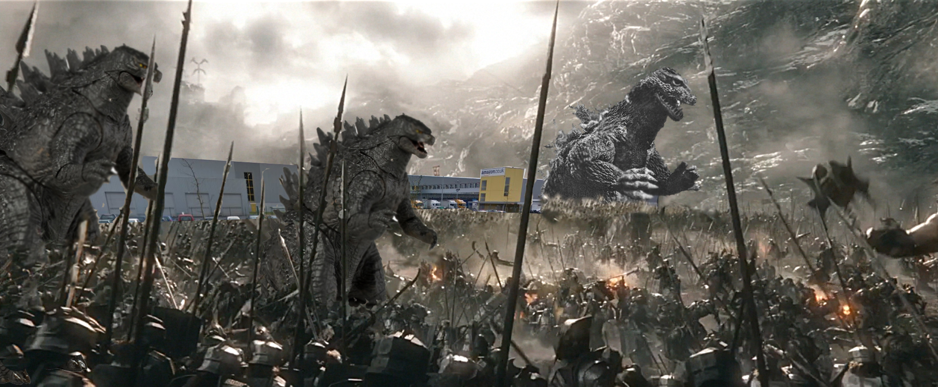 The marauding Orc army was bred by Swansea City council for one purpose. To destroy the Godzillas, should they ever threaten the people of Swansea. Unfortunately, Tricia Jones from Killay got into an argument with Barry one day when she said he was looking at her funny. She took the matter up with her line manager who called Barry in for an HR interview. Just an informal chat. Barry panicked and accidentally reduced the IT support department to rubble. Tricia messaged the Orcs on FaceBook who immediately launched an all-out attack.