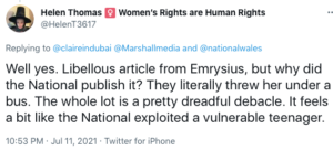 Just three days ago TN was accused on social media of ‘exploitation’. An aggrieved critic wrote: “Well yes. Libellous article from Emrysius, but why did the National publish it? They literally threw her under a bus. The whole lot is a pretty dreadful debacle. It feels a bit like the National exploited a vulnerable teenager”.