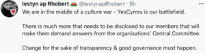 A further critic admitted in one Tweet “we are in the middle of a culture war…” and also online wrote: “I have decided to open up about my recent experience on the YesCymru Central Committee. In Jan ‘21, I wrote & presented a document to the CC (Central Committee) on the urgent need to modernise the governance, transparency and oversight of the CC (Central Committee). It is on record & minuted. It was largely ignored”.
