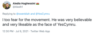 But this latest crisis for YC, and outbursts which followed Mr Jobbins’ disclosure that he was leaving, shed light on what is happening in the Welsh nationalist and independence movements generally. They come after other, disturbing, disclosures made only by The Eye, and have not featured in the mainstream media. A backer of Welsh independence, who has become disillusioned with YC, said recently on Twitter: “Thank you for all your support but the constant hounding by Yes Cymru members and committee members has literally made me fear for my safety, my family’s safety and my mental health. If this is your vision of Wales, then I want no part of it…”.