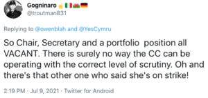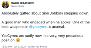 The sudden announcement that Sion Jobbins is quitting as Chair of YesCymru (YC) has been met with total amazement by some in the Welsh nationalist community, while in other quarters there appears to be jubilation. There are worries now about the oversight in the group, with another backer of YC stating online: “So Chair, Secretary and a portfolio position all VACANT. There is surely no way the CC (Central Committee – the governing body of YC) can be operating with the correct level of scrutiny. Oh and there’s that other one who said she’s on strike”.